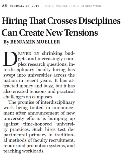 Interesting misleading headline in this article from COHE. Gist of the story is folks at North Carolina State University recognized that cross-disciplinary hiring challenges organizational status quo – especially department level control of resources – and that this manifests in, among other places, tenure and promotion. Their response was to take the bull by the horns and create evaluation process and funding scheme to attenuate these effects. No small part of the challenges emerge from departmental understanding that a primary component of their raison d’être is producing basic research. As definitions of what that means shift change can be expected. And over time we can expect that colleges that do not have primary research results as a fundamental output will catch on in the spirit of “if they can do it, maybe we can too.”