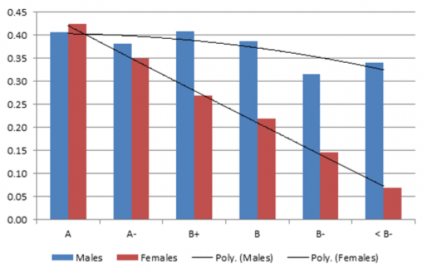 In other other words, on average (assuming lots of things are equal) women may take a stronger “you can’t do this” signal from not getting an A in intro courses than do men. Evidence shows it happens in economics and some STEM fields too.