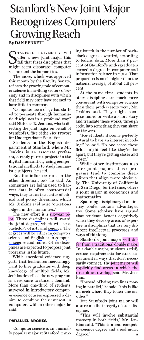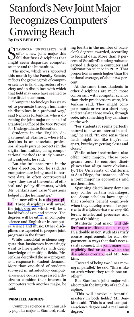Joint Humanities & Computer Science Majors at Stanford March 20, 2014 Dan Ryan computer science, digital humanities, interdisciplinarity, joint degrees, Stanford Leave a comment From the Chronicle of Higher Education (21 March 2014) Share this: Click to share on X (Opens in new window) X Click to share on Facebook (Opens in new window) Facebook Like Loading... Related