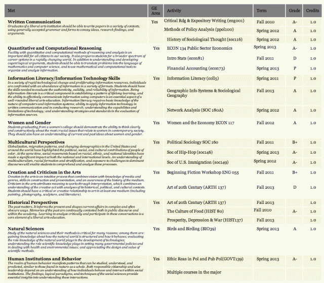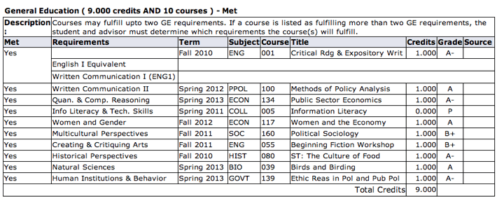 Move away from the “check box” mentality by re-configuring Banner and MAPs so they don’t simply indicate that a requirement has been fulfilled, but rather track and document how and how many times each requirement has been fulfilled, providing both student and anyone who looks at the transcript a visualization of her general education. Include the rationales described above in the transcript/MAP.