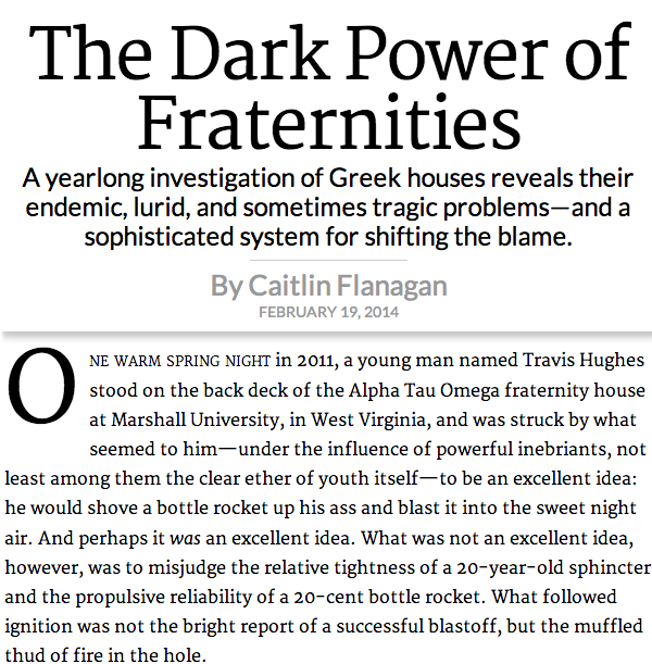 Don’t be distracted by the lurid, even bizarre, events narrated at the start of the article. What it’s really about is the organizational distortion of priorities in higher education and the legal question of “Who Assumes the Risks of College Life?” It’s a fascinating tale of finance, insurance, and the use of “good” lawyering to protect organizations and blame individuals. A story of how the very organizations to which kids pledge loyalty turn on them at the first sign of trouble. Long story short: fraternity organizations self insure; members are “covered” only if they don’t break any of the rules; fraternity behavior consists of breaking the rules; that behavior frequently leads to tragedies and disasters. But then, what organization would want to put its fate in the hands of large groups of 20 year old men?
