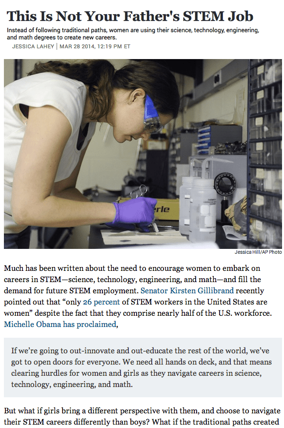 STEM Women: Perhaps Many Paths and Many Destinations March 25, 2014 Dan Ryan careers, STEM, women Leave a comment FROM Continue Reading at the Atlantic online Share this: Click to share on X (Opens in new window) X Click to share on Facebook (Opens in new window) Facebook Like Loading... Related