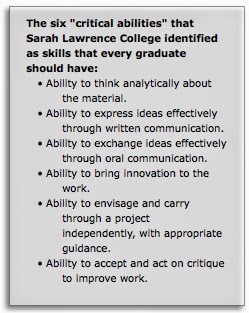 All that, naturally, makes colleges just a bit nervous. Sarah Lawrence is fighting back with its own way of measuring value. The faculty came up with six abilities they think every Sarah Lawrence graduate should have. They include the ability to write and communicate effectively, to think analytically, and to accept and act on critique.