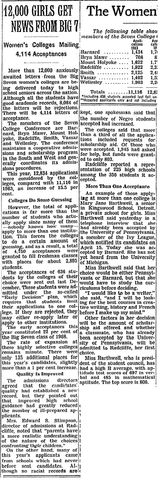 The New York Times is “celebrating” its digitization of its 1964 issues with the occasional article from “50 years ago this week.” This piece from when admissions to selective east coast women’s colleges was a news item. Note that acceptance rates at half the schools have gone down but half remain at about the same levels they were 50 years ago.