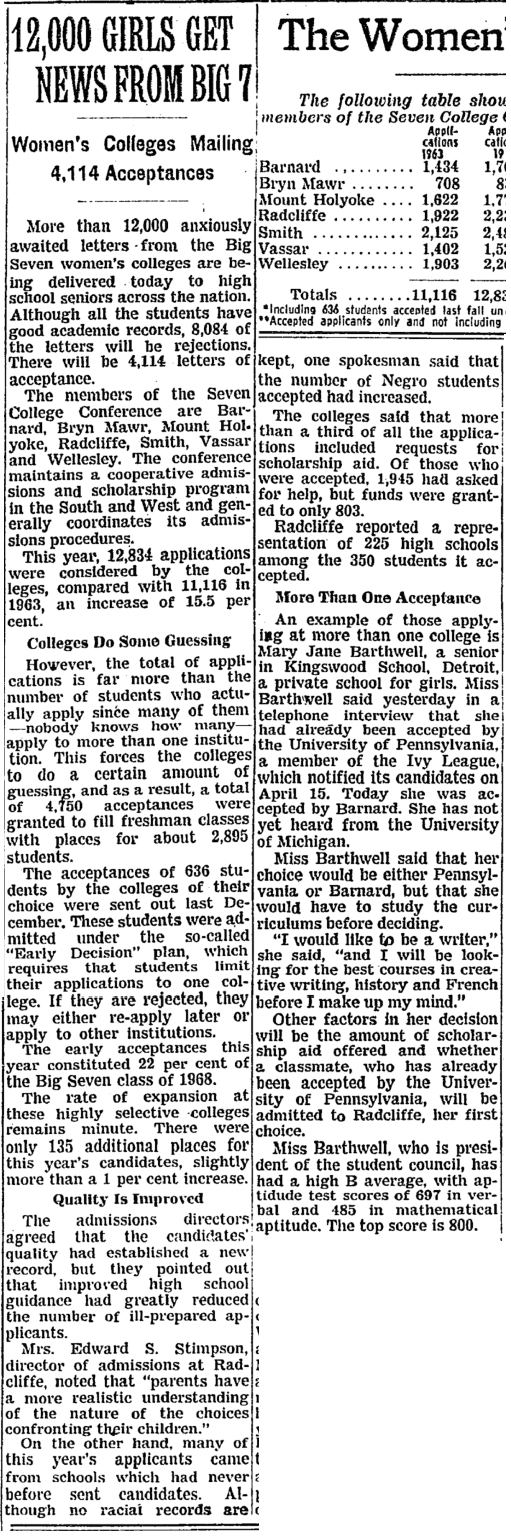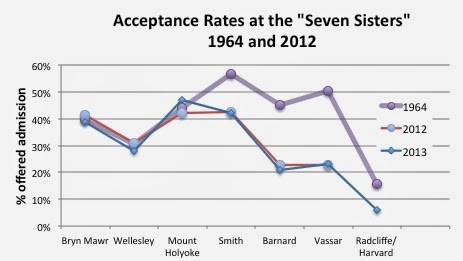 The New York Times is “celebrating” its digitization of its 1964 issues with the occasional article from “50 years ago this week.” This piece from when admissions to selective east coast women’s colleges was a news item. Note that acceptance rates at half the schools have gone down but half remain at about the same levels they were 50 years ago.